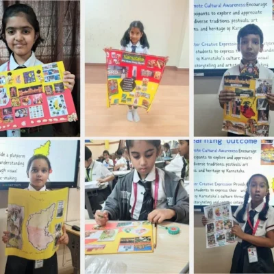 Grade 2 showcased “Colours of Our Culture – Karnataka Collage,” creating stunning visual stories that highlighted Karnataka’s scenic beauty, monuments, dance forms, and food. Their proud presentations reflected deep understanding, expressive communication, and appreciation of our cultural roots.