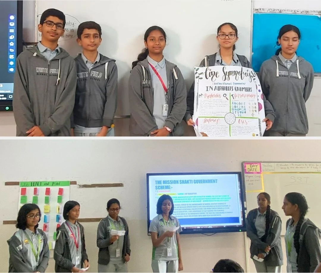 Grade 8 students showcased their research and presentation skills through PPTs on natural phenomena and a timeline activity on India’s freedom struggle.